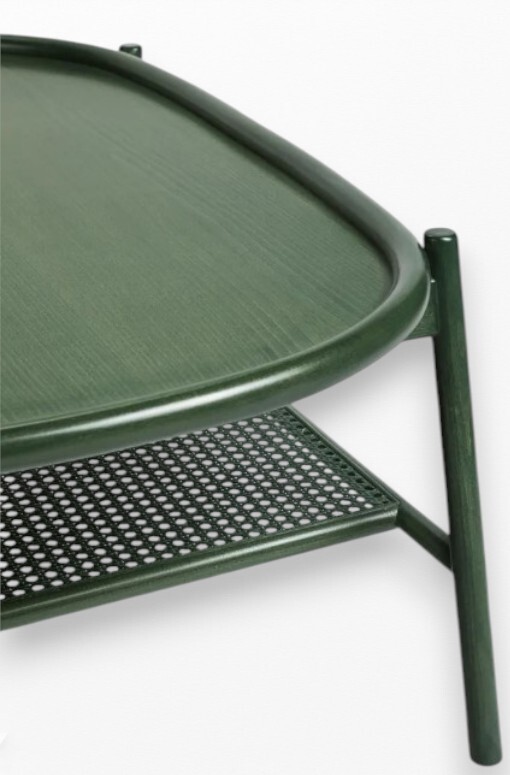 Stolík DROP M predstavuje sofistikované spojenie ľahko ohýbaného bukového dreva a rafinovaneho ratanu. Spodná polica je pletená z prírodného ratanu, napnutá na drevenom ráme s precíznym napätím – inšpirácia pre názov „Drop“, ktorý symbolizuje práve napätú membránu bicieho nástroja. Vrchná doska stola je orámovaná jemne zahnutým bukovým lemovaním, čím vzniká elegantný výraz a mäkké línie. Ratanová polica vytvára vzdušný, otvorený úložný priestor, ktorý je nielen praktický, ale aj vizuálne ľahký. Tento stolík je dostupný v dvoch tvaroch a veľkostiach a môže samostatne vytvárať výrazný dizajnový prvok, alebo byť súčasťou zladeného setu nábytku.