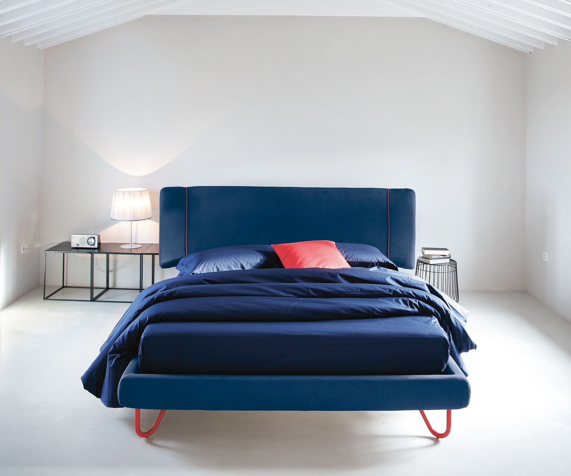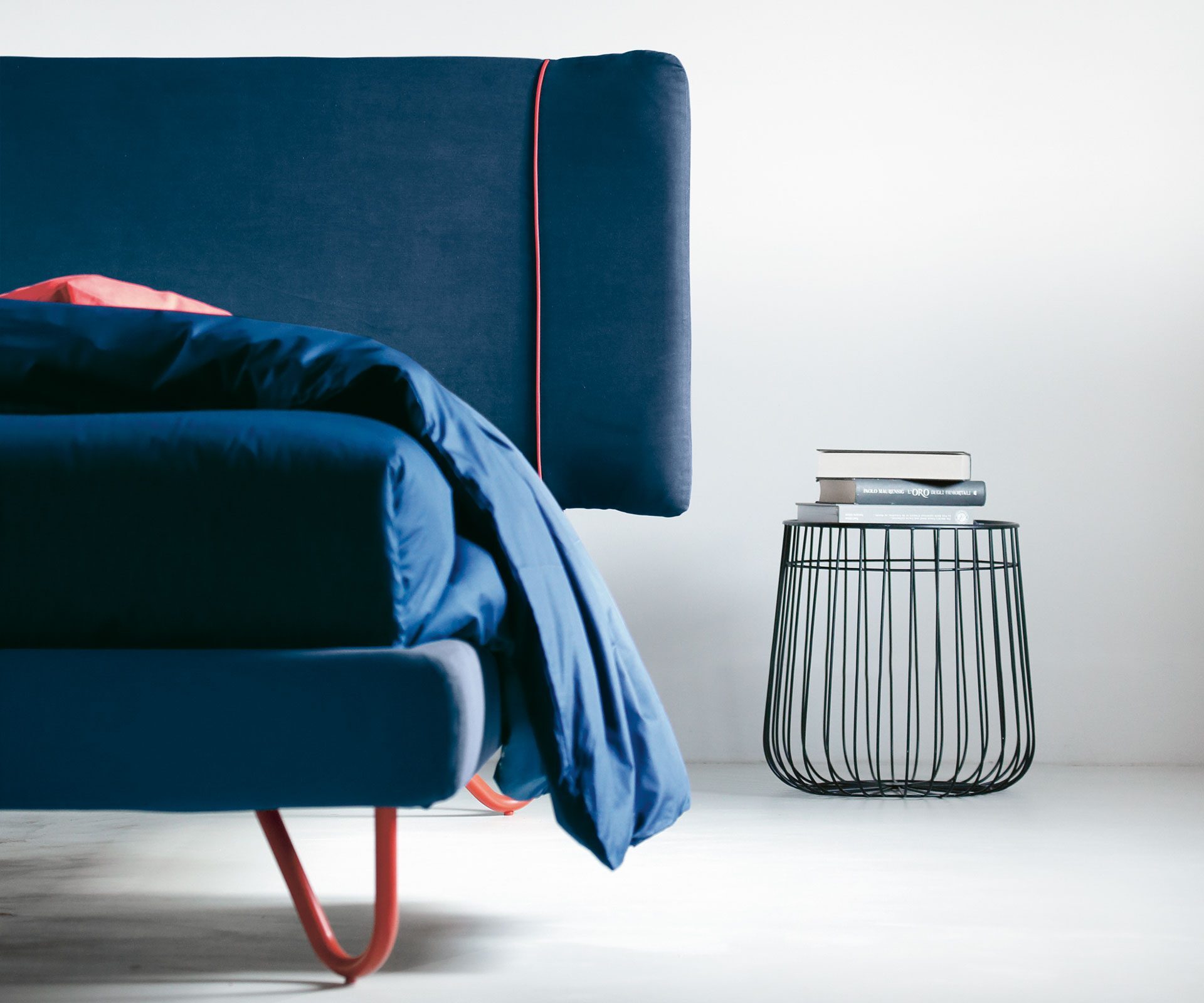 Zavesené nožičky dodávajú posteli ľahký, vzdušný a takmer „plávajúci“ vzhľad, ktorý podčiarkuje jej moderný a minimalistický dizajn. Kontrastné lemovanie prináša elegantný a výrazný detail, ktorý zvýrazňuje línie čela aj rámu a dodáva modelu sofistikovaný súčasný charakter.