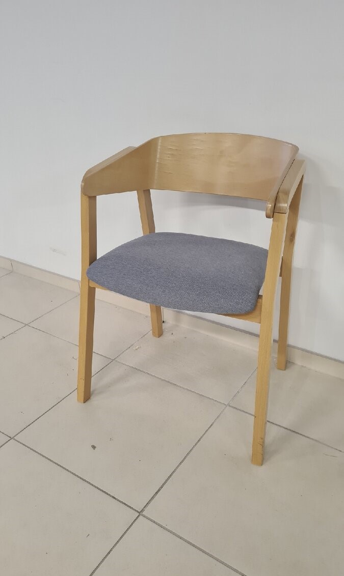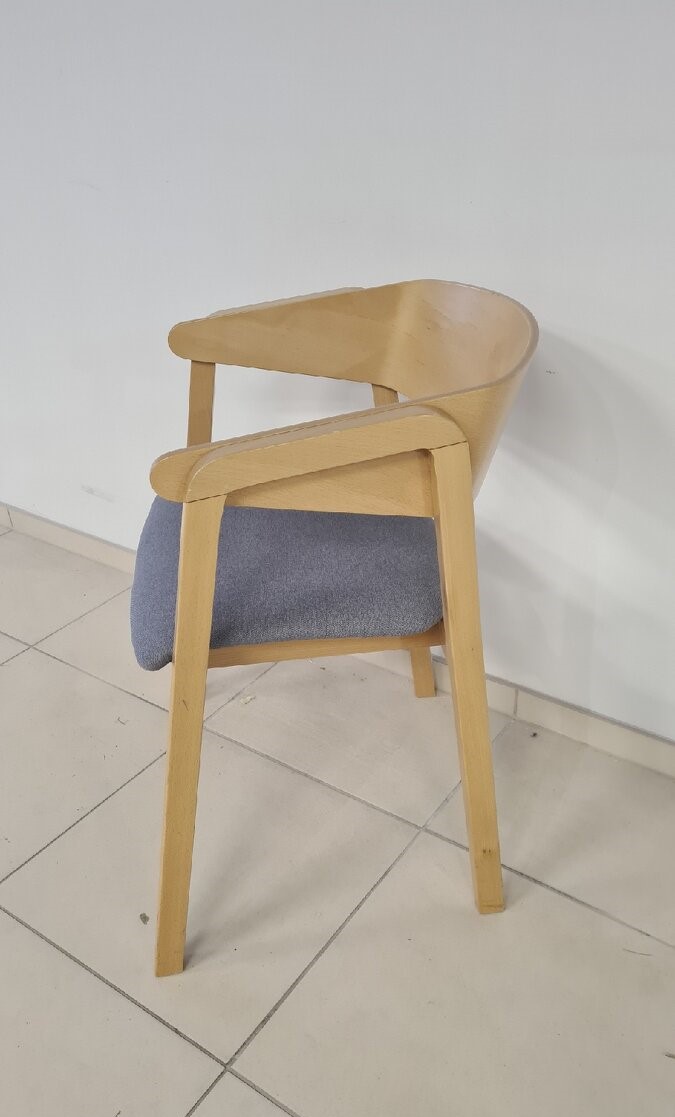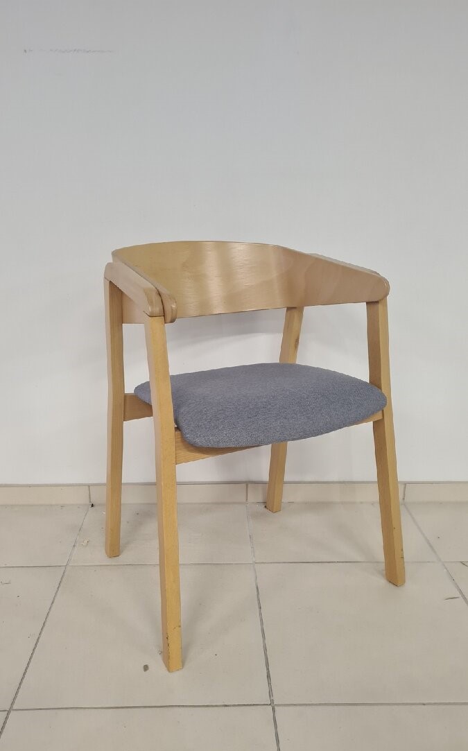 Prírodné drevo, šedá látka na sedáku. K dispozícii jeden kus.