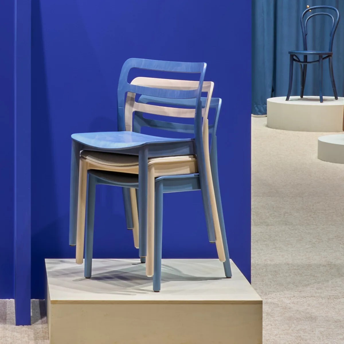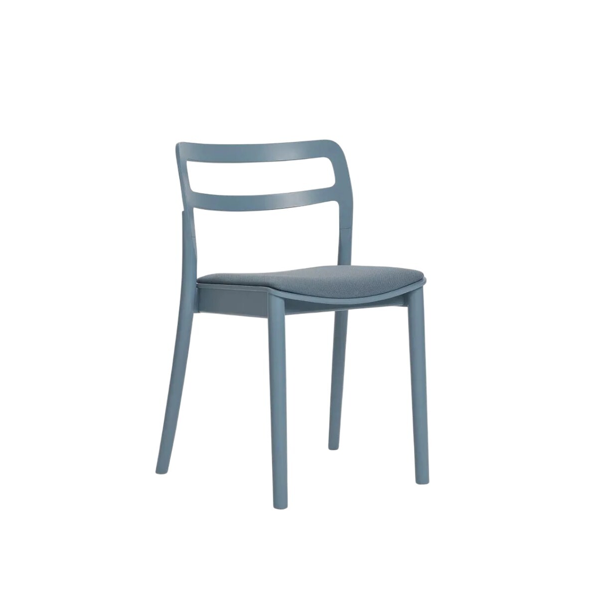 Celodrevená ľahká stolička s čalúneným sedákom.