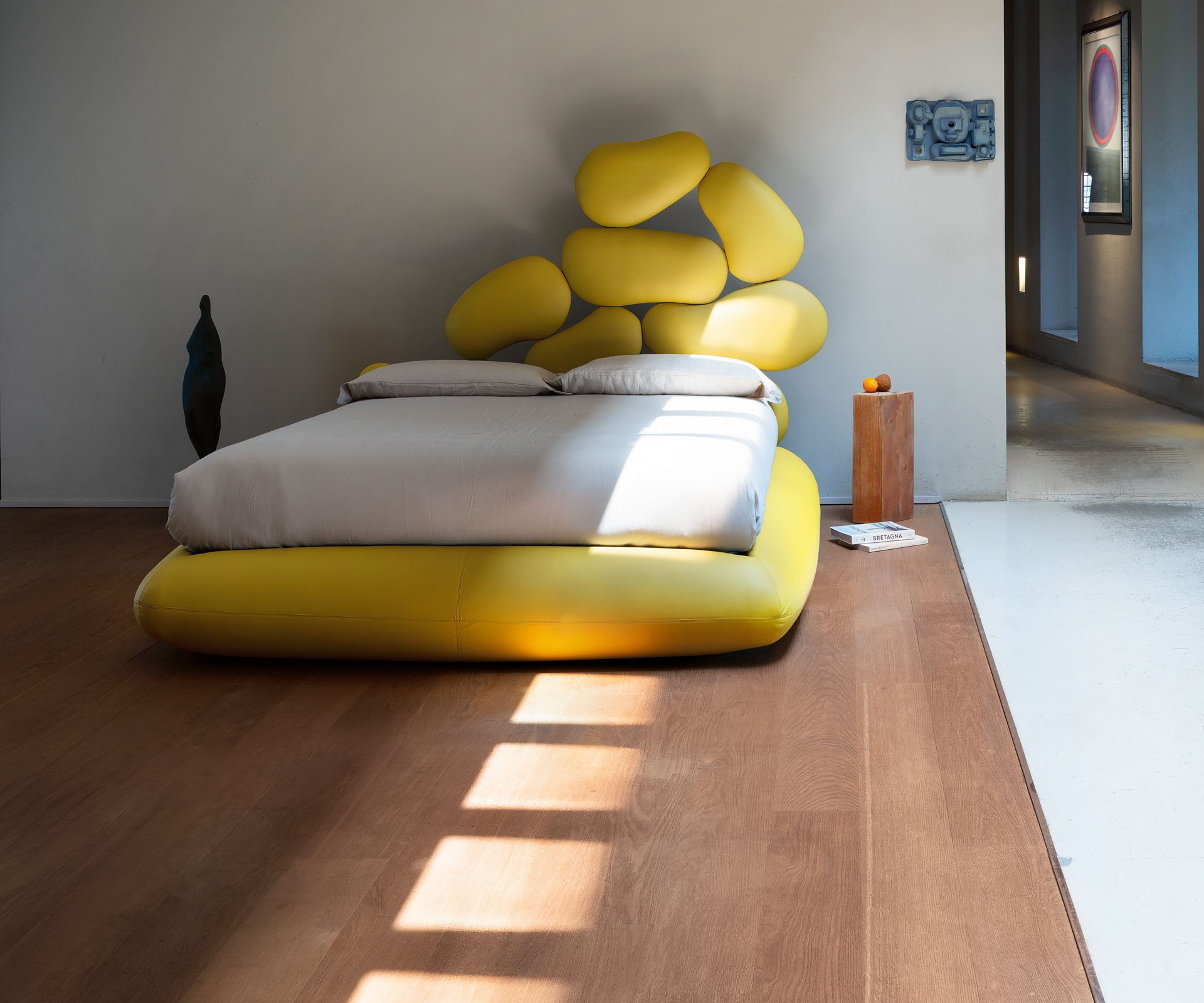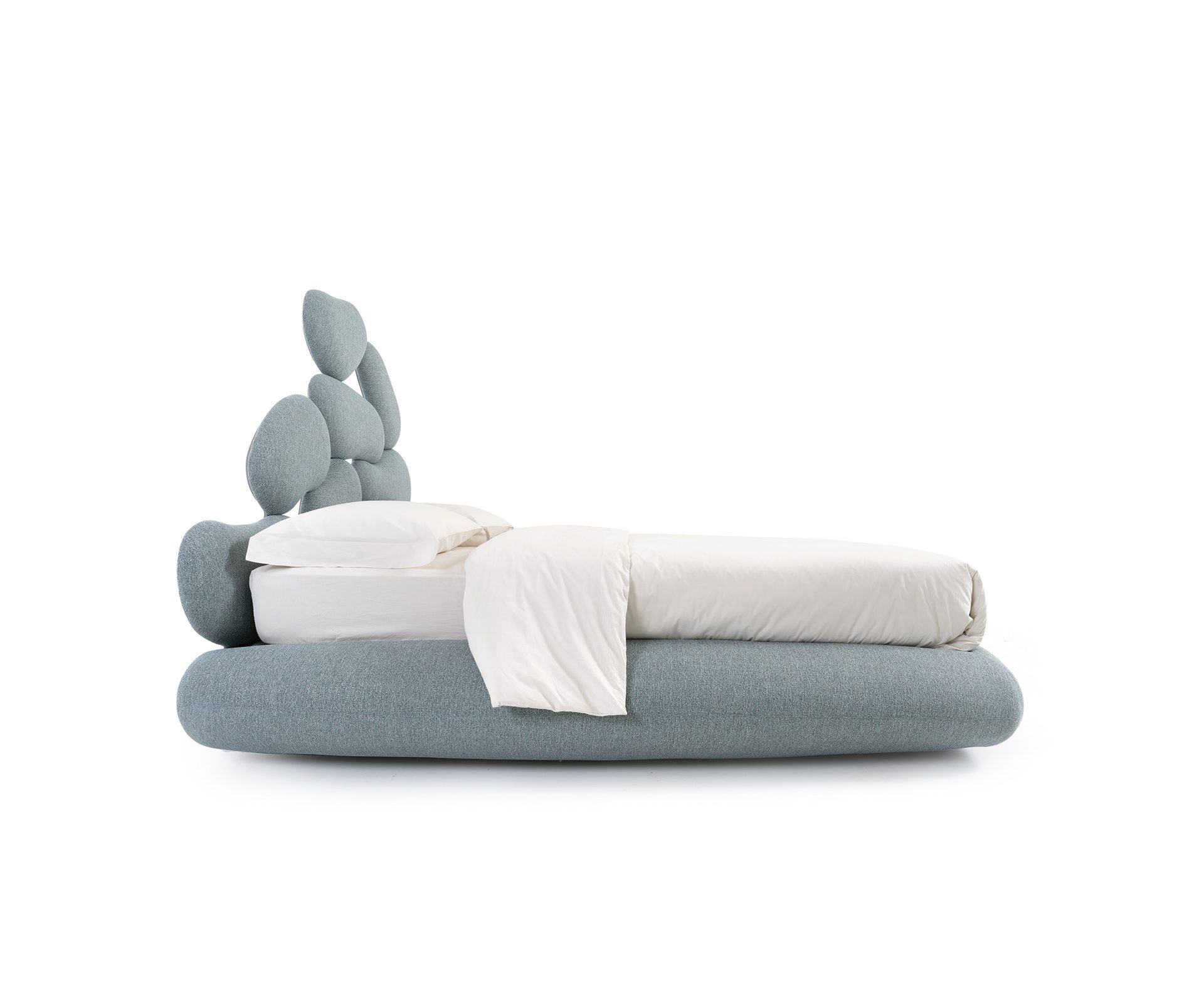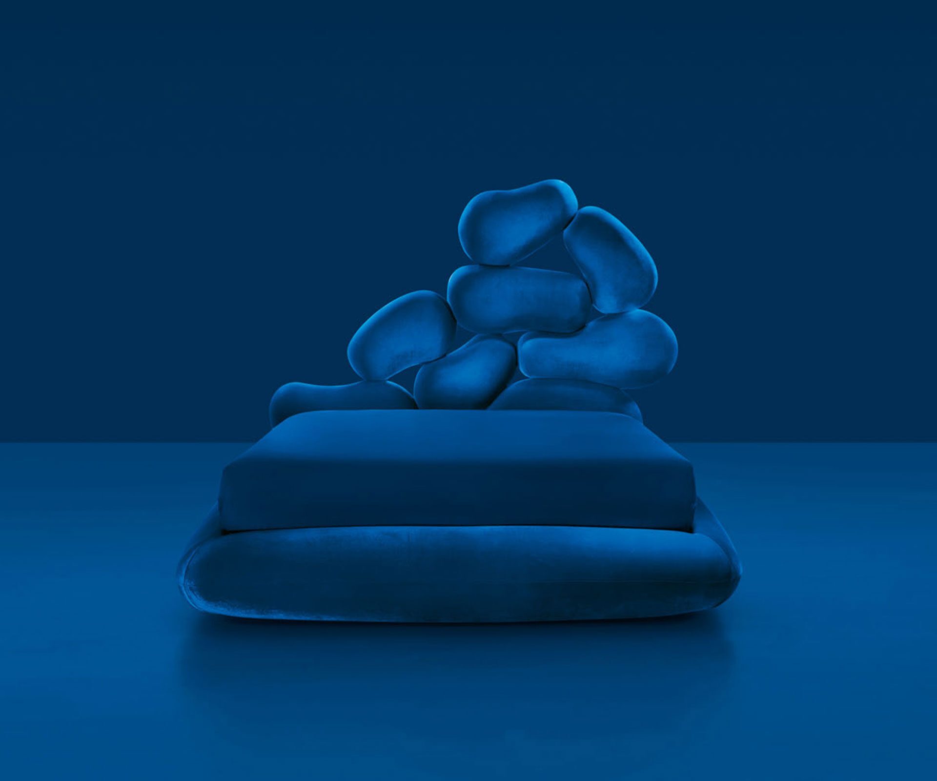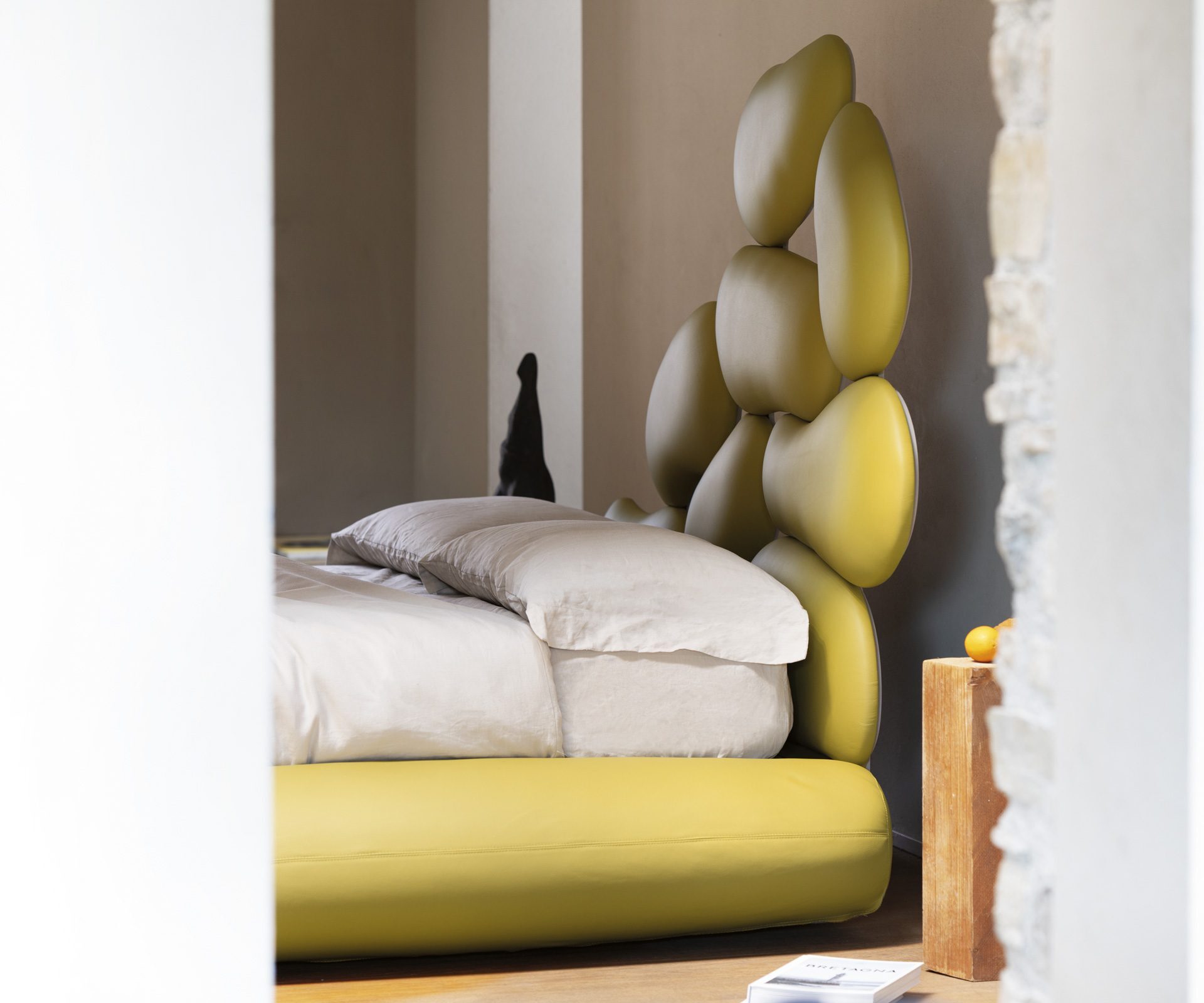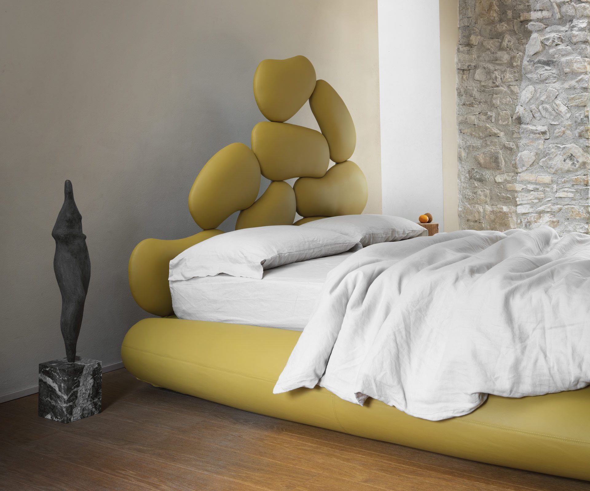 Najvýraznejším prvkom postele je drevené čelo vyrezávané pantografom, tvorené zaoblenými tvarmi, ktoré pripomínajú okruhliaky vyhladené prúdiacou riečnou vodou a vyplavené na breh. Čelo je vizuálne veľmi pôsobivé a je starostlivo potiahnuté mäkkou gumou skúsenými čalúnnickými remeselníkmi, vďaka čomu každý prvok pôsobí ako skutočný kamienok. Tvrdý (vizuálny) a mäkký (haptický) kontrast postele odkazuje na známe binárne koncepty ako surové/varené či horúce/studené, ktoré antropológ Claude Lévi-Strauss interpretuje ako symbolické systémy odhaľujúce prechod človeka z prírodného do kultúrneho sveta.