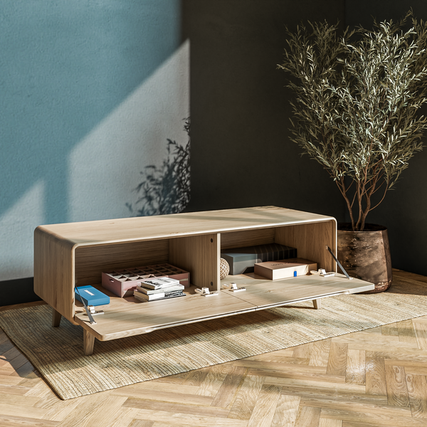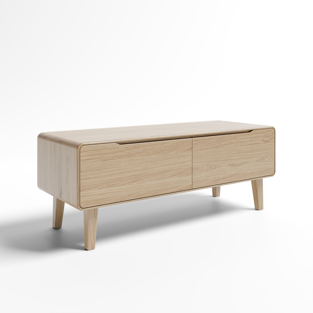 TV skrinka Štokholm V2 s výklopnými dverami alebo dvoma výsuvnými šuflíkmi.